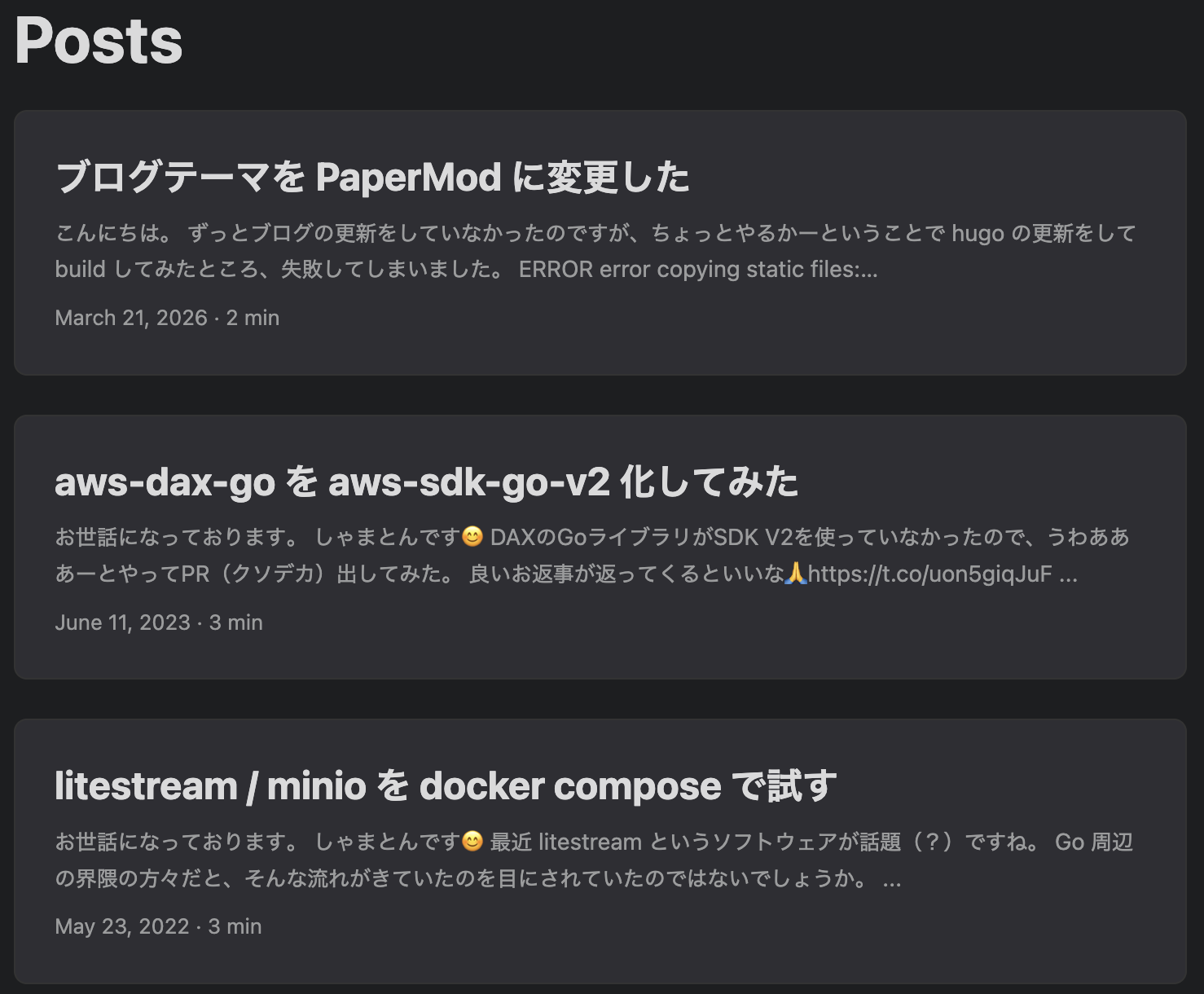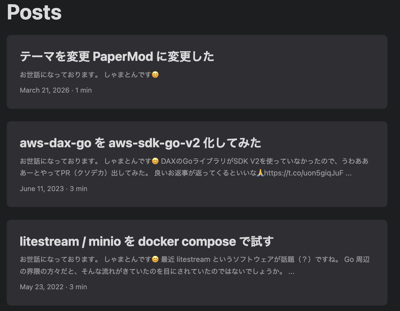 調べたところ現在のページ構成に近いテーマとして PaperMod というものがあったので、これを採用することにしました。